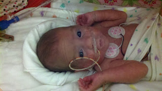 Blair was able to kangaroo Harli for almost three hours. I think they both needed this time together, because Blair's smile lit up the room tonight. Harli's vitals remained perfect the whole time Blair was holding her, and for the most part she laid still and just slept. Harli weighed 1450 grams, or 3lbs 3ozs again. Another fifty grams and Blair gets to start dressing her again!